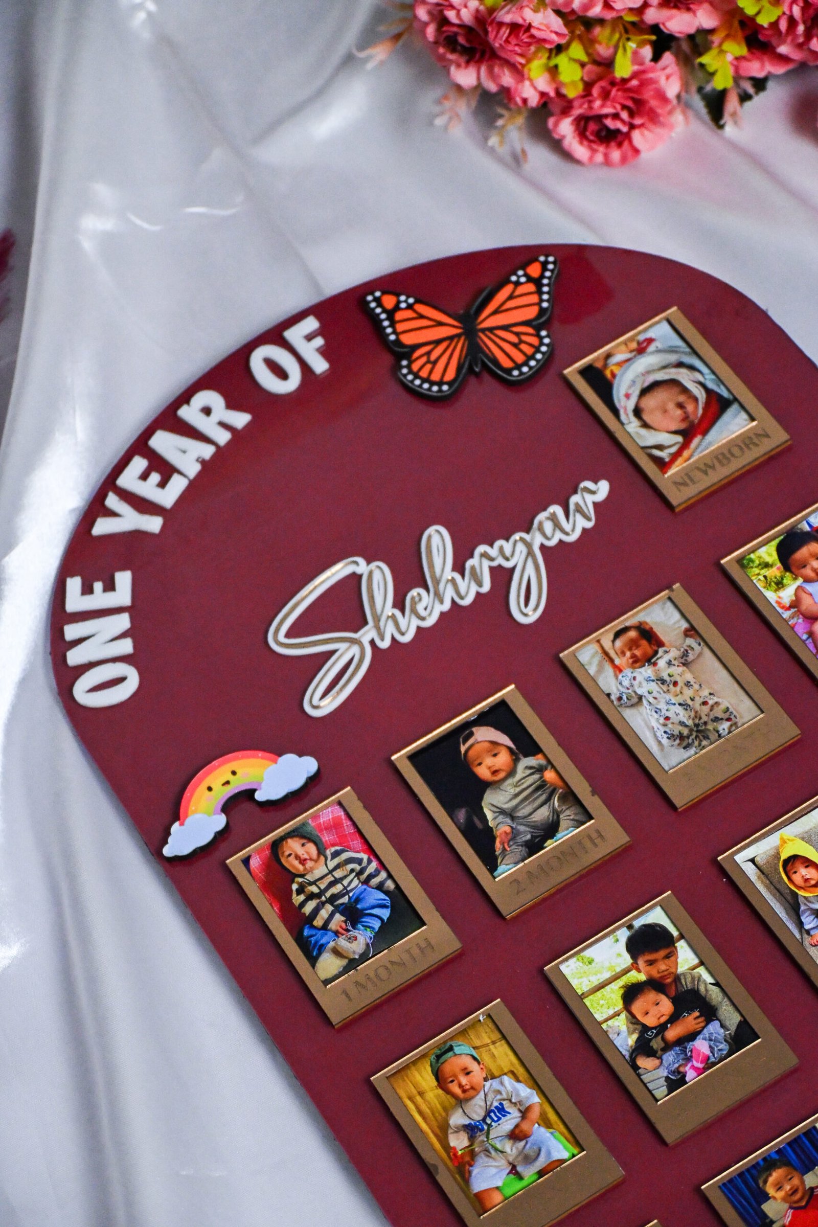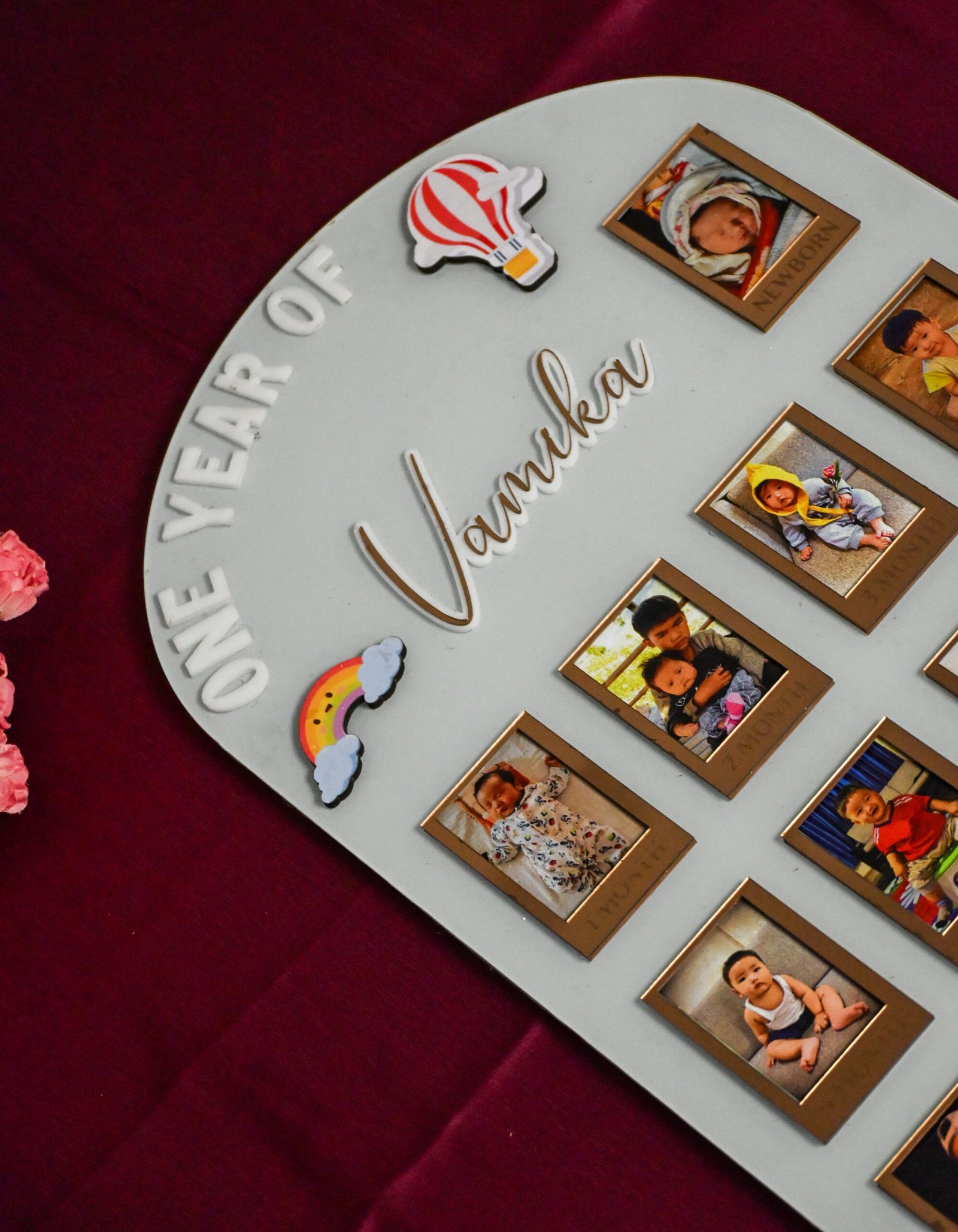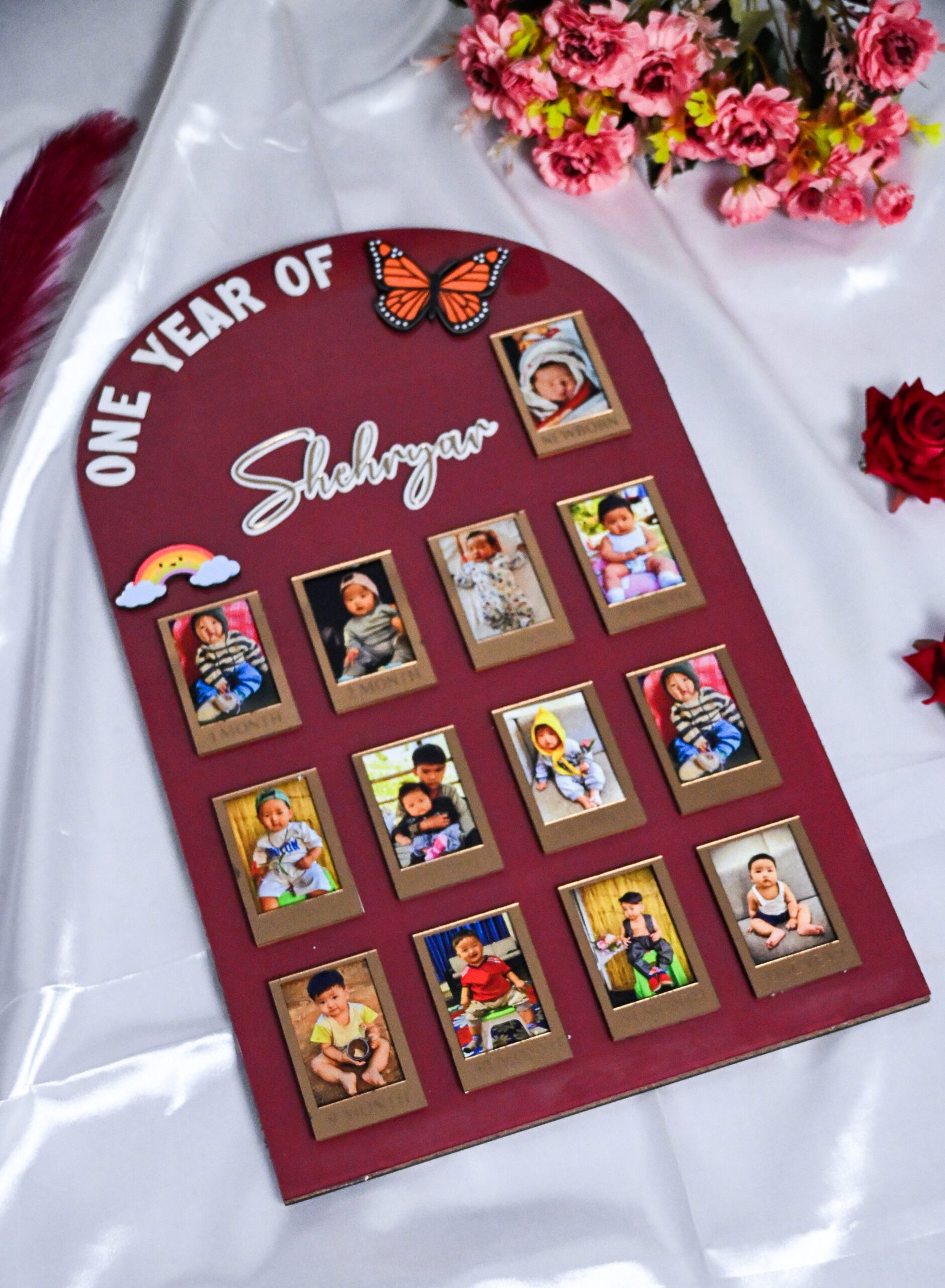 Made with exceptional craftsmanship, the board features a sturdy high-quality MDF base, ensuring durability that lasts for years. The acrylic customizations add a glossy, premium touch—creating a modern, luxurious look that instantly elevates your space. Each month has its own dedicated space to hold photos from newborn to 12 months, capturing the growth of your little one in a visually stunning timeline you’ll treasure forever.