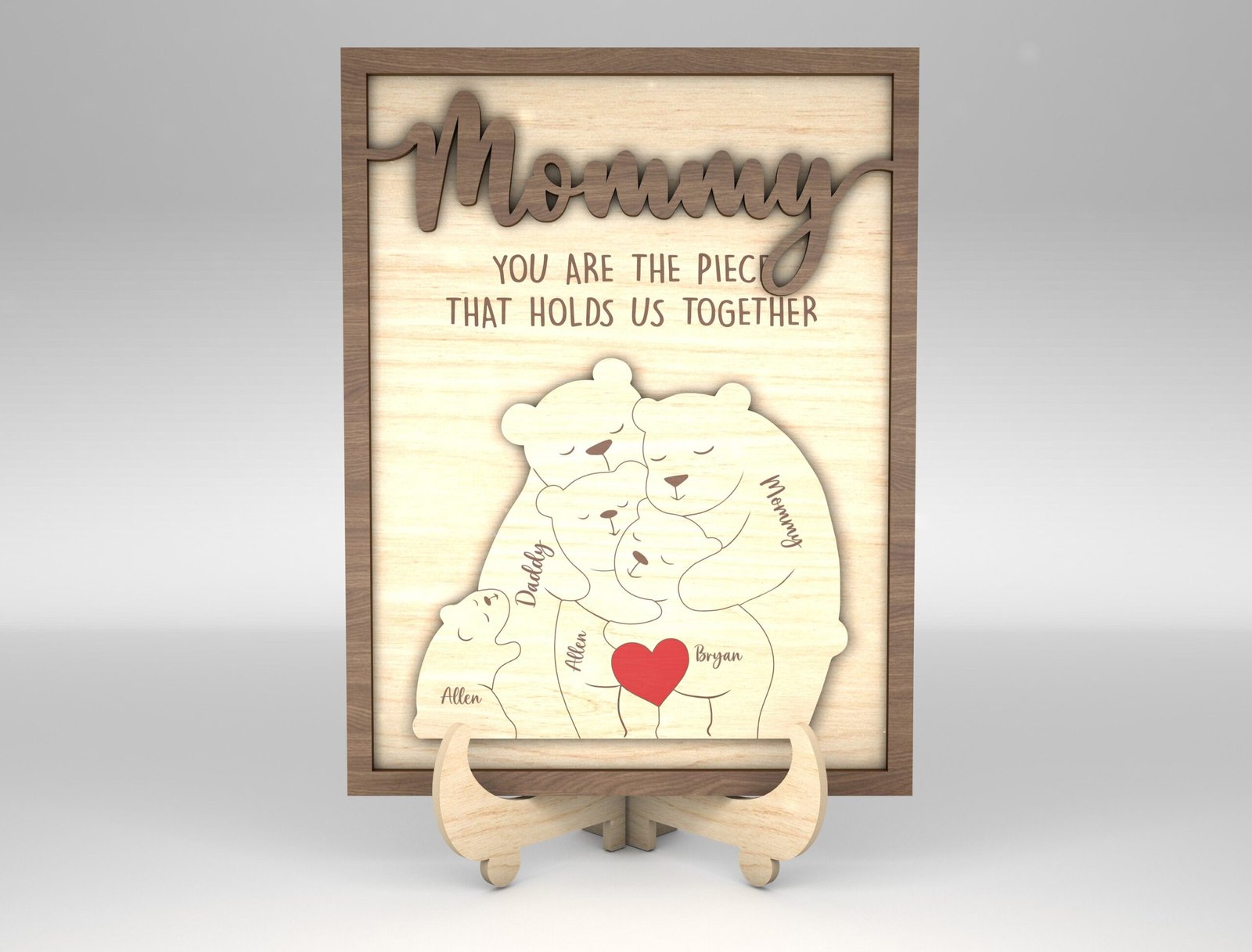 - Create a personalized wooden sign with the puzzle bear featuring each family member’s name.